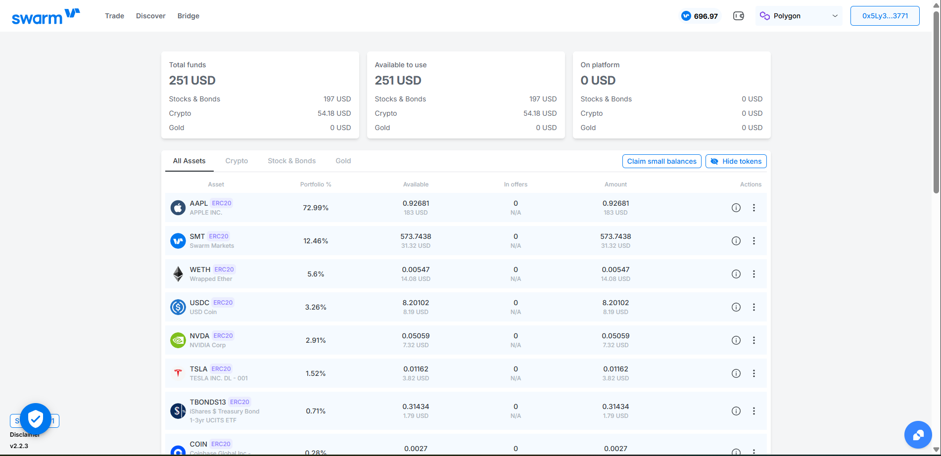 The Swarm Wallet, found at https://app.swarm.com/wallet/ is where you can view the assets in your connected Ethereum addresses and also how much of each you have in the Swarm protocol.